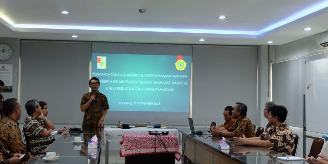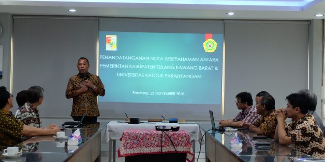 Pusat Studi Adaptasi dan Resilensi Desain Lingkungan (CAREDs) yang telah genap berusia 2 tahun, dibawah Lembaga Penelitian dan Pengabdian kepada Masyarakat, baru saja melakukan penjajakan kerjasama dengan Pemerintah Kabupaten Tulang Bawang Barat, Lampung. Acara penandatanganan Nota Kesepahaman ini dilakukan pada hari Rabu (21/11/2018), dihadiri langsung oleh Bupati Tulang Bawang Barat beserta jajarannya, dan Rektor Universitas Katolik Parahyangan beserta jajarannya.